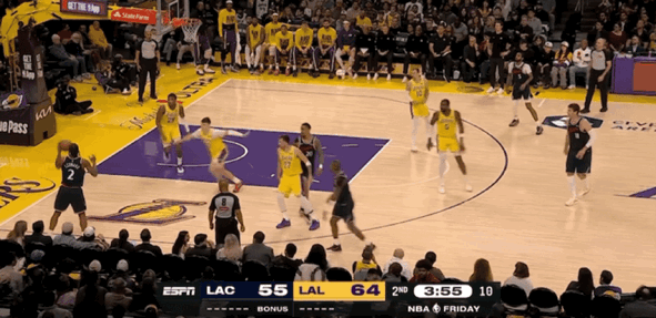 首节比赛,莱昂纳德吸引防守注意力,为队友创造进攻终结机会。他没有过多的出手欲望,而是选择更多的分享球,引领快船多点开花与湖人展开进攻端互飙。不过湖人有着更好的团队进攻发挥,依靠着东契奇的神勇进攻表现,湖人下起三分雨逐步拉开分差,快船在首节比赛落后对手11分。