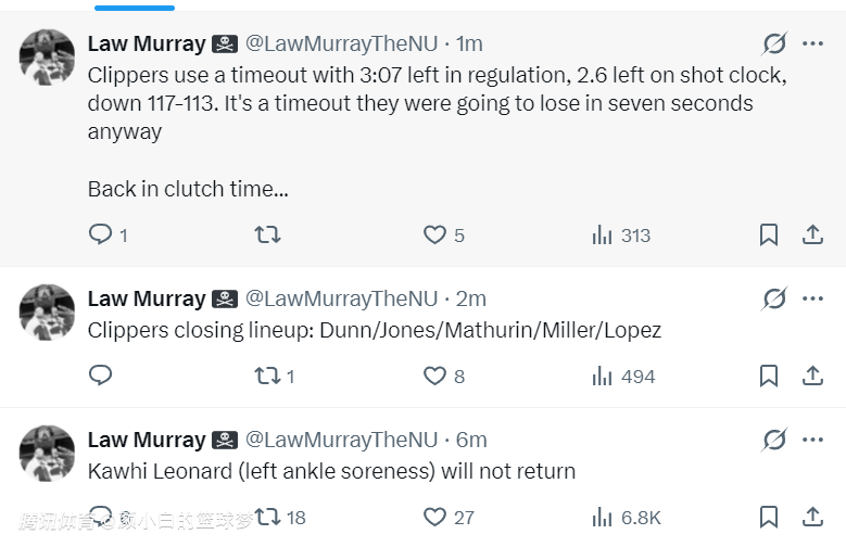 根据快船队记劳里-穆雷的报道,伦纳德是左脚踝酸痛本场比赛将不会回归。