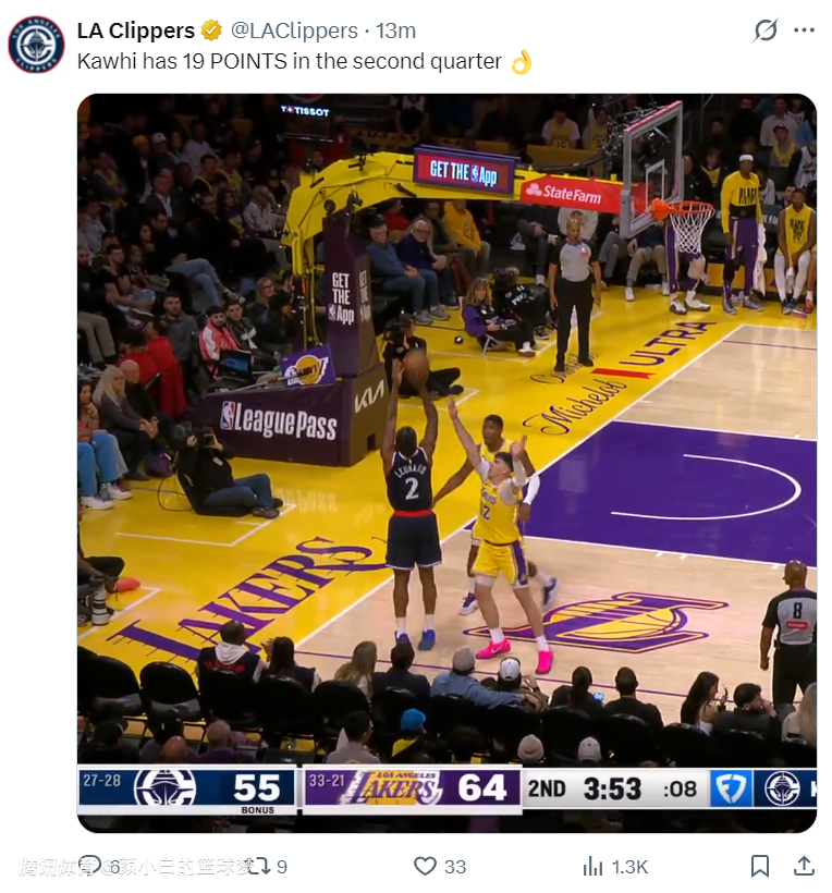 首节湖人将伦纳德防的很死,他首节只有1次出手拿到2分3助攻,但第二节两队进入轮换后伦纳德就完全不同了,因为在他身前的防守者变成肯纳德、八村垒之流,他在短短4分钟里连拿11分。
