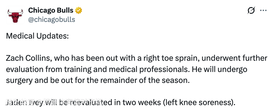 北京时间2月22日,公牛官方发布伤病报告,扎克-科林斯因脚趾手术,赛季报销,艾维因左膝酸痛,两周后重新评估。