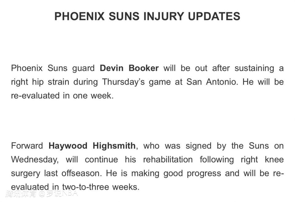 太阳同时更新了海伍德-海史密斯的伤情。他不久前刚与太阳签下一份两年合同。这位前锋在休赛期接受了膝盖手术,目前恢复情况有所进展,但仍将继续康复治疗,2至3周后再次复查。这与此前太阳记者约翰-甘巴多罗的报道一致——海史密斯至少还需数周才能迎来他在太阳的赛季首秀。