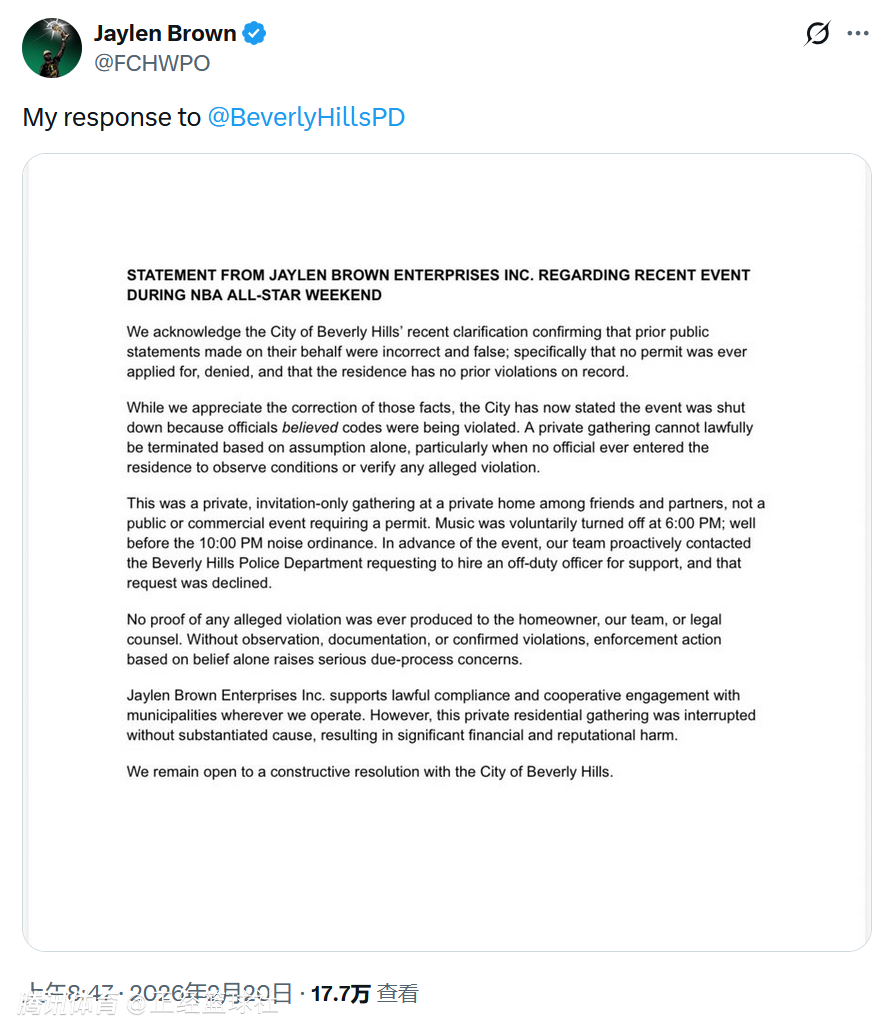 此外,贝弗利山市行政官亨特-科菲也亲自向布朗致歉,但同时补充称,市政府工作人员当时“观察到了被认为违反城市法规的情况,仅因此原因叫停了活动”。不过,这份道歉并未得到布朗的认可,他表示,即便在道歉声明中,依然包含着一些不实内容,这样的道歉他无法接受。目前,布朗正与自己的团队进一步沟通协商,后续或将正式启动法律程序,维护自身及团队的合法权益。