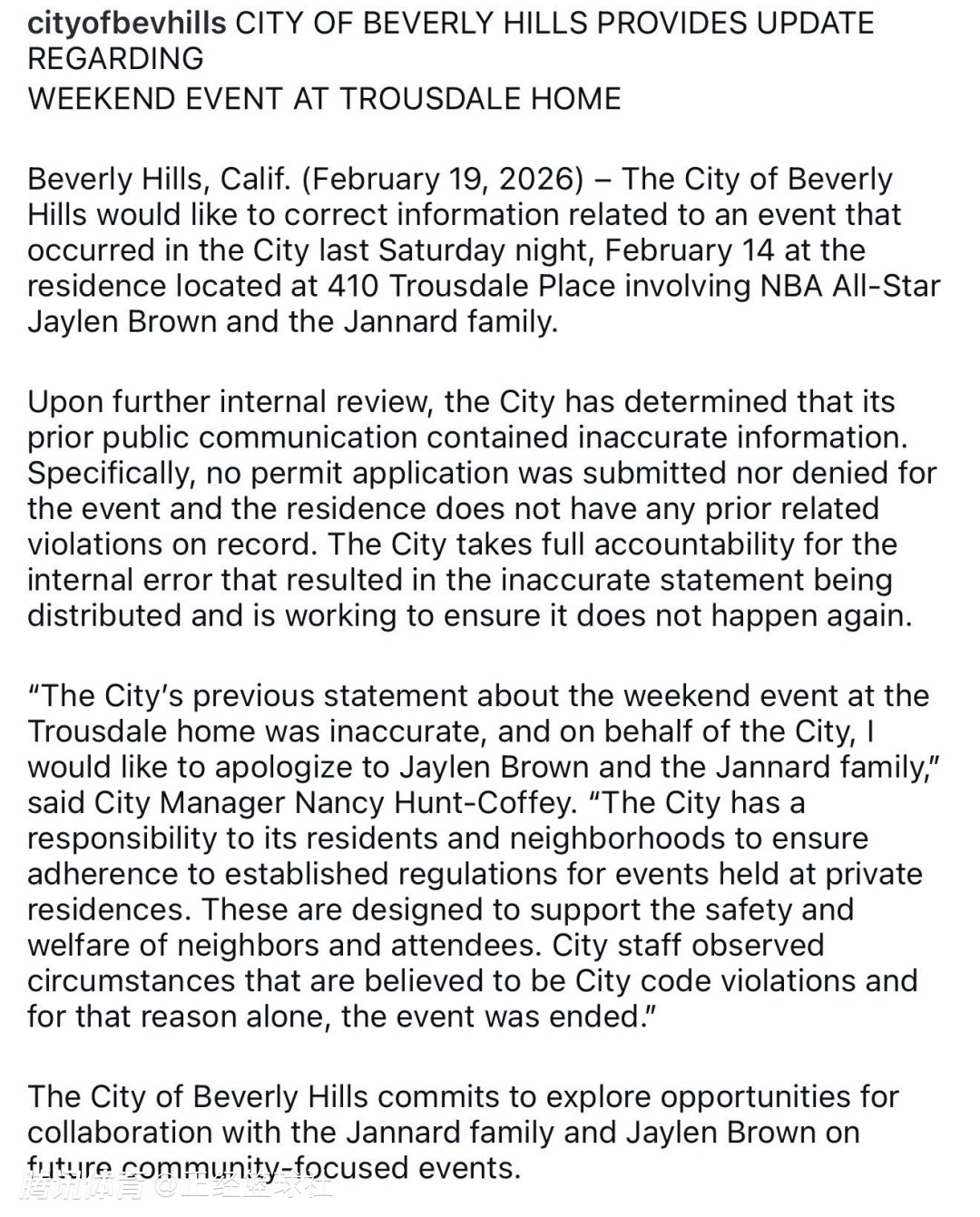 事件发酵后,贝弗利山市政府已公开向布朗作出道歉,并明确承认,此前发布的关于警方叫停活动原因的声明内容存在不实之处。该市在声明中写道:“经过进一步内部核查,市政府确认此前发布的公开信息存在错误,具体而言,该活动并未提交或许可申请,也未被驳回,该住宅也没有任何相关违规记录。市政府对此次因内部失误导致不实声明发布承担全部责任,并将采取措施避免此类情况再次发生。”