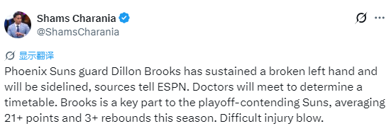 北京时间2月22日,据名记Shams报道,ESPN消息源透露,太阳后卫狄龙-布鲁克斯左手骨折,将缺席后续比赛。