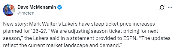 北京时间2月22日,湖人随队记者Dave McMenamin撰文报道,湖人大幅提升2026-27赛季季票价格一事,湖人官方表示这反映了当前市场状况和需求。