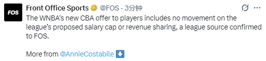 北京时间2月22日,根据Front Office Sports报道,WNBA向球员工会提交的新版劳资协议提案中,在工资帽与收入分成两项上未作出任何让步。