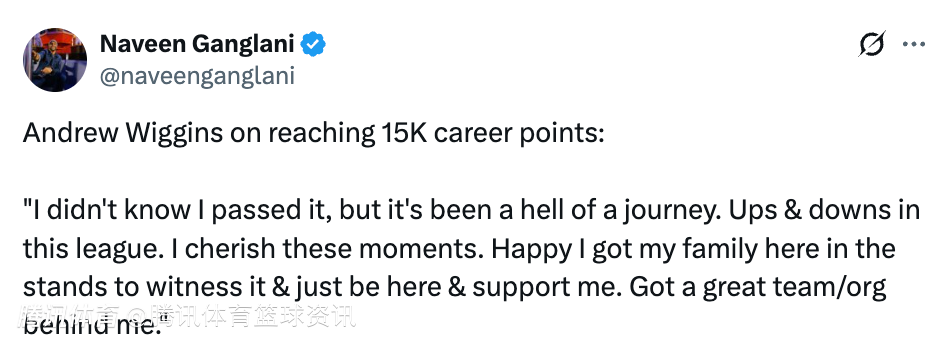 谈到自己15000分里程碑,维金斯表示:“这是段非凡的旅程,在这个联盟起起伏伏。我非常珍惜现在的时刻,很高兴我的家人在这里见证这一切,他们一直支持我,身后还有一支很棒的球队和团队。”