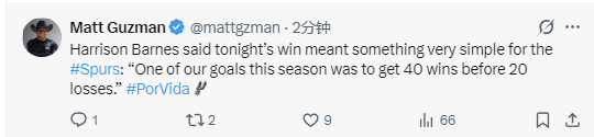 马刺队老将巴恩斯此役得到14分2篮板1助攻,赛后他接受媒体采访,表示这场胜利对于马刺队意义重大。巴恩斯说道:“我们本赛季的目标之一,就是在输掉20场之前先拿到40胜。”
