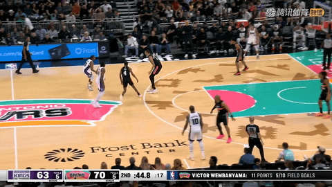 第二节还剩1分44秒至36秒,约翰逊和福克斯通过罚球取分,文班亚马完成扣篮,瓦塞尔再中三分,马刺连续5次进攻得分,把比分从59:65拉大到65:73。