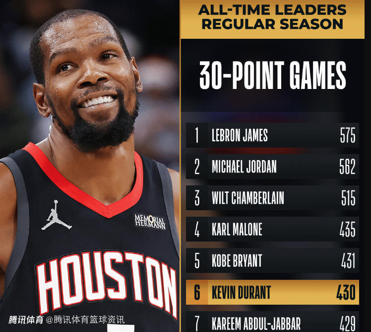 北京时间2月22日,NBA常规赛继续进行,火箭队106-108不敌尼克斯队。杜兰特此役得到30分6篮板3助攻,这是他职业生涯第430次在常规赛中砍下30+,超越贾巴尔,升至NBA历史第6位。目前在杜兰特身前的球员是科比,他总计431次在常规赛砍下30+。