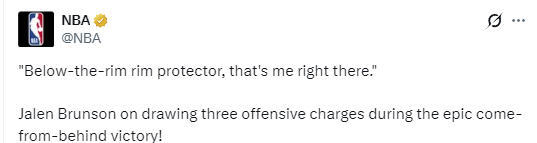 在谈到自己制造3次进攻犯规的表现时,布伦森调侃道:“嗯,篮筐守护者,说的就是我。”