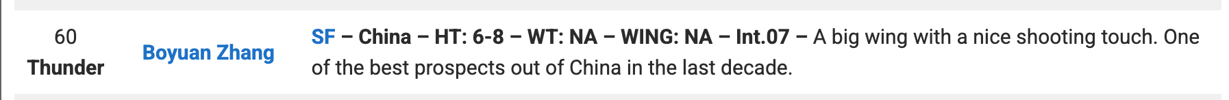 该网站给出的张博源评级为:身材高大的侧翼球员,投篮手感出色,近十年来中国前景最好的新秀之一。