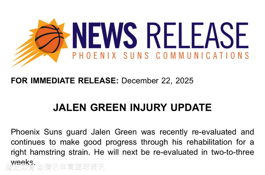 北京时间12月23日,太阳队官方发布公告,宣布球员杰伦-格林右腿筋拉伤恢复进展良好,但仍需至少再缺阵2-3周,届时将重新评估伤情。