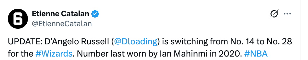 北京时间2月23日,据球衣记者Etienne Catalan报道,拉塞尔将自己在奇才的球衣号码从14号换成了28号,上一位身披奇才28号球衣的还是2020年的马辛米。