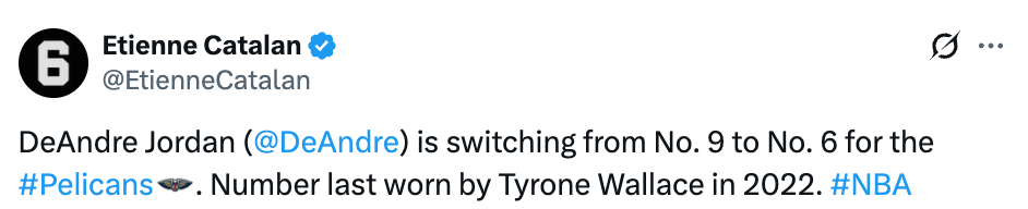 北京时间2月23日,据球衣记者Etienne Catalan报道,小乔丹将自己在鹈鹕身穿的9号球衣更换为6号。