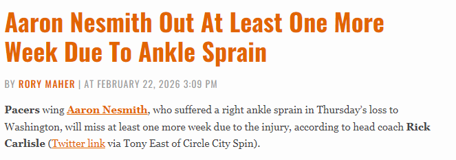 内史密斯在周五的比赛中仅出战15分钟,周六对阵奇才的背靠背比赛已缺席,周一对阵独行侠将是他连续第二场缺阵,此后还将至少再缺席两场比赛。