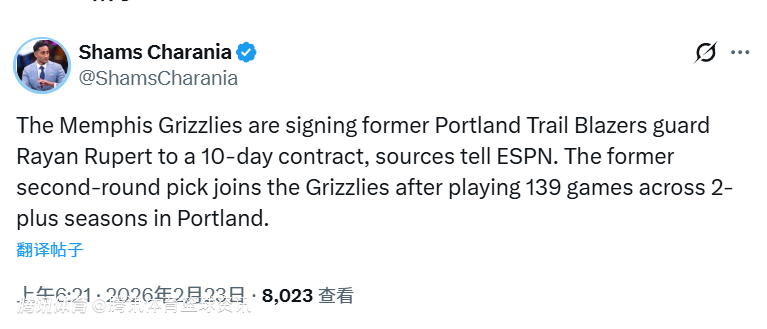 北京时间2月23日,据名记Shams报道,ESPN消息源透露,孟菲斯灰熊将签下前开拓者球员吕佩尔,双方签下一份10天短合同。