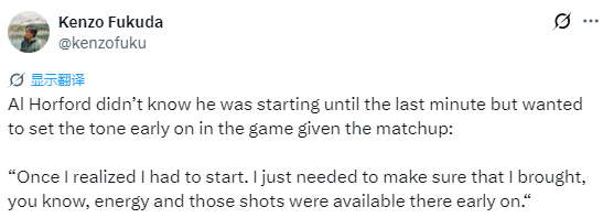 霍福德说道:“我们一上来就奠定了比赛基调。不过他们在第三节打出了一波攻势,让比赛变得非常艰难。好在第四节我们还是找到了办法,最终拿下了比赛。我意识到自己必须从一开始就站出来,确保自己拿出能量。早期机会就出来了,我就是抓住了那些投篮机会。我整场的想法就是,让球队打出节奏、打得更快、让球运转起来。我觉得我们全队开局做得非常好,这也为后面的比赛奠定了关键基础。”
