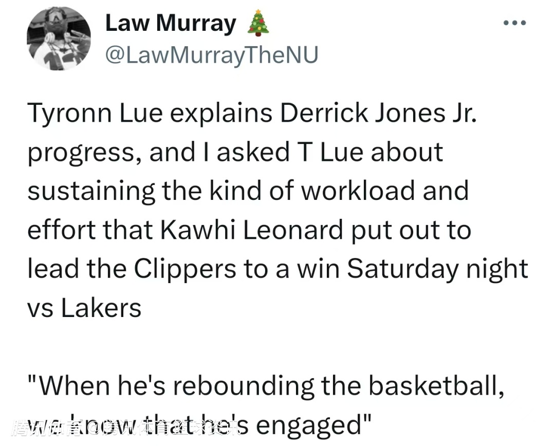 北京时间12月23日,快船主帅泰伦-卢接受媒体采访,谈及如何延续莱昂纳德在击败湖人一战的火热状态。