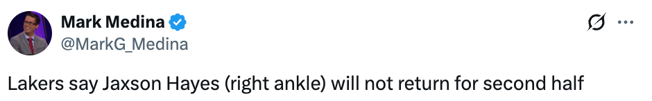 北京时间2月23日,NBA常规赛,湖人主场对阵凯尔特人,半场休息期间,湖人官方宣布,海斯右脚踝受伤,本场比赛不会回归。