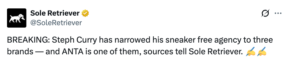 北京时间2月23日,据美媒球鞋账号SoleRetriever报道,库里已将潜在签约的球鞋品牌缩小至三家,安踏位列其中。