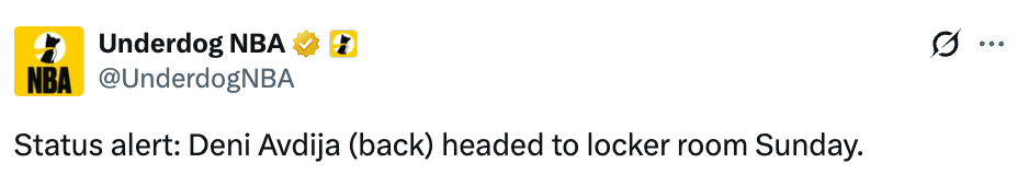 本场比赛阿夫迪亚一度因伤出战成疑,但他最终还是选择出战,不过在比赛刚开始不久,阿夫迪亚似乎遭遇背部旧伤复发,随后很痛苦地返回更衣室。在阿夫迪亚伤退前,他打了59秒,没有出手,数据全部为0。