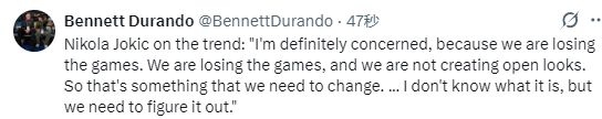 约基奇谈到球队目前的趋势时表示:“我确实很担心,因为我们一直在输球。我们不仅输球,而且创造不出空位出手的机会。这是我们必须改变的地方……我不知道问题到底出在哪,但我们必须把它找出来。”