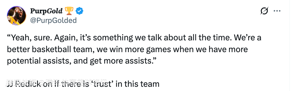 被问及球队是否存在“信任问题”时,雷迪克回应道:“没错,当然。这也是我们一直在强调的事。我们是一支更好的球队,当我们潜在助攻更多、真正助攻更多时,我们能赢下更多比赛。”