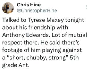 谈及他与爱德华兹的友谊,马克西表示彼此十分尊重。他说,有一段录像记录了他和五年级时又矮又壮、体格结实的爱德华兹对位打球的画面。