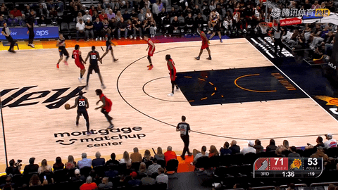 第三节还剩4分28秒到还剩1分24秒期间,太阳依靠二次进攻追分:伊戈达罗先是进攻篮板后补扣得手,马鲁阿奇又完成空切扣篮和补篮,将比分从67:51追至71:55,把分差从18分追到16分。同节还剩3分30秒到节末,开拓者遭遇连续3分30秒得分荒,太阳趁机把之前20分的劣势缩小到14分,第三节结束比分为71:57。