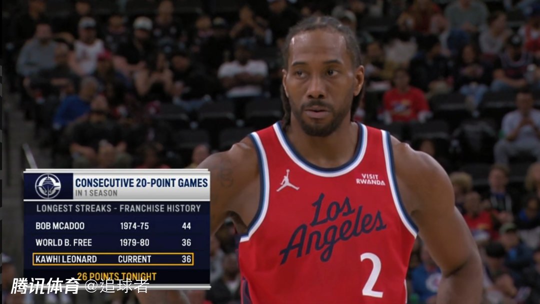 2、小卡连续36场20+追平沃尔德-弗里并列快船队史第二长,鲍勃-麦卡杜连续44场20+队史第一,小卡距离超越麦卡杜还差9场