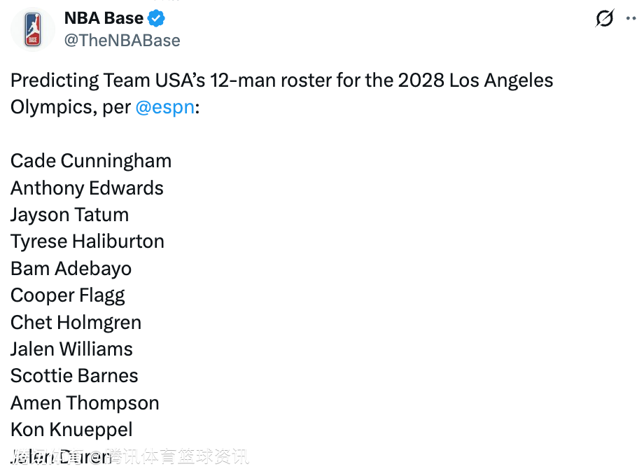 ESPN预测28年奥运会美国男篮12人大名单:凯德-坎宁安、爱德华兹、塔图姆、哈利伯顿、阿德巴约、弗拉格、霍姆格伦、杰伦-威廉姆斯、斯科蒂-巴恩斯、阿门-汤普森、克努佩尔、杜伦。