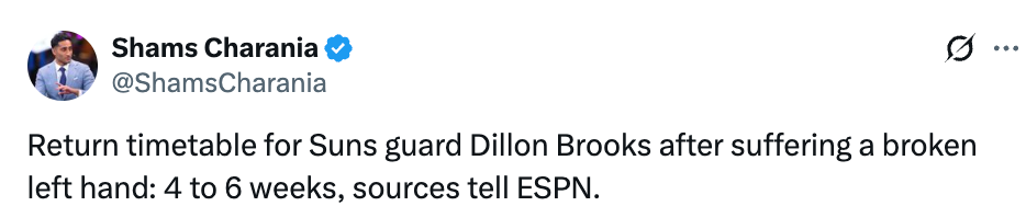 北京时间2月24日,据名记Shams报道,太阳球员狄龙-布鲁克斯左手骨折,预计回归时间为4-6周。