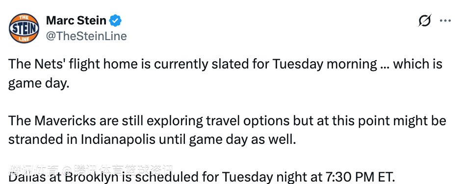 随后Stein跟进报道,篮网队的返程航班目前计划在周二上午起飞,而这一天正是比赛日。独行侠队仍在探索出行方案,但目前来看,他们也有可能要在比赛日当天才能离开印第安纳波利斯。独行侠对阵篮网的比赛,原定于美国东部时间周二晚7:30进行。