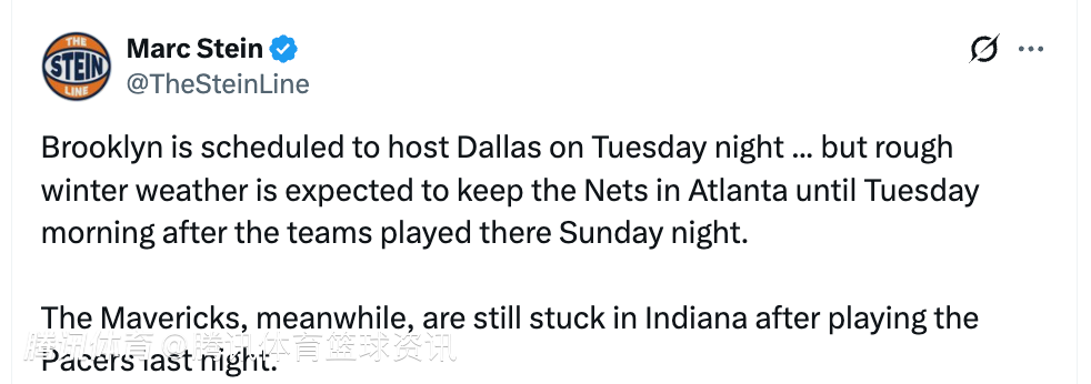 北京时间2月24日,据名记Stein报道,篮网队原计划在当地时间周二晚主场迎战独行侠队,但在周日晚与老鹰队的比赛结束后,恶劣的冬季天气预计将迫使篮网队在亚特兰大停留至周二上午。