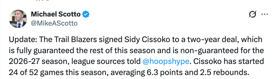 北京时间2月24日,前不久,据名记Shams报道,开拓者和双向合同球员西索科新签了了一份为期2年的合同,今天,据另外一名记者Scotto跟进报道,开拓者队与西索科签下的2年合同,具体为本赛季剩余部分全额保障,但2026-27赛季为非保障。