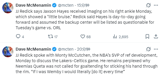 雷迪克与NBA负责裁判发展的高级副总裁Monty McCutchen进行了沟通,讨论湖人和凯尔特人之间出现的比赛争议。他依旧对凯塔将手穿过篮筐却未被吹罚干扰球感到困惑。雷迪克直言:“我们也不想让球员手指受伤,但这规则真的有点离谱——如果我是文班亚马,我真的会每次对手投篮都直接把手伸进篮筐里,只要不犯规就行。因为我觉得这回报也太大了。”