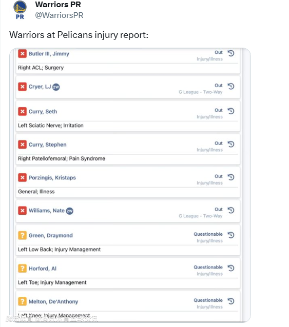 北京时间2月24日,NBA常规赛继续进行,勇士明日对阵鹈鹕。赛前,勇士官方公布球队本场比赛伤病报告。库里继续缺阵,新援波尔津吉斯也无法登场。