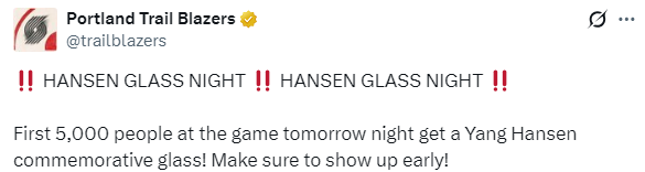 北京时间2月24日,波特兰开拓者官方宣布,明天球队将在主场举办杨瀚森玻璃杯之夜,前5000名到场的观众将获得一个杨瀚森纪念玻璃杯。