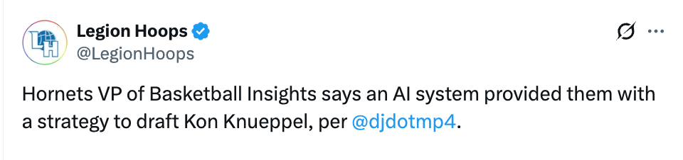 根据InvisibleTechnologies的一份文件显示,哈雷尔直接将选中克努佩尔归功于球队的AI选秀策略。“商业层面的效果几乎立竿见影,”黄蜂篮球情报与分析副总裁帕特里克-哈雷尔表示,“短短几周内,Invisible就为我们提供了一套AI选秀策略,帮助我们选中了克努佩尔。他随后带领黄蜂夺冠,并当选NBA夏季联赛冠军赛MVP。他在决赛砍下21分,率队击败萨克拉门托国王。这也是黄蜂队史第一座夏季联赛冠军奖杯。”