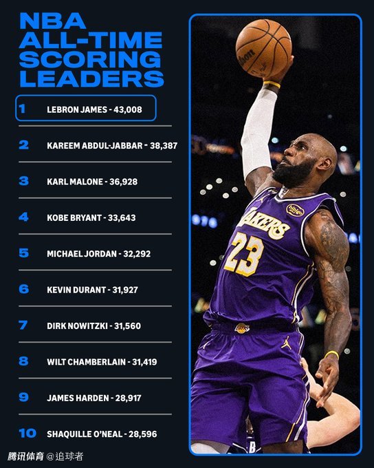上一场湖人在主场22分惨败凯尔特人,詹姆斯全场21投9中拿到20分4篮板5助攻,迎来1600场和43000分里程碑,成为NBA历史上第一位43000分先生,目前詹姆斯常规赛总得分为43008分,稳坐历史得分王宝座,已经比历史第二的贾巴尔(38387分)多得4621分。