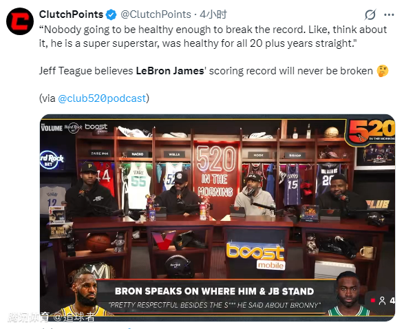 詹姆斯晒照庆祝达成43000分里程碑,这一成就前无古人,估计也是后无来者,对此前NBA球员杰夫·蒂格在节目中表示:没有人能保持健康来打破这个纪录,他是一位超级巨星,连续20多年都保持健康。我记得勒布朗只有一次因脚踝受伤缺席了很多比赛,那是在他刚加入湖人队的时候;他已经连续健康地打了20多年球了,这真是太疯狂了。