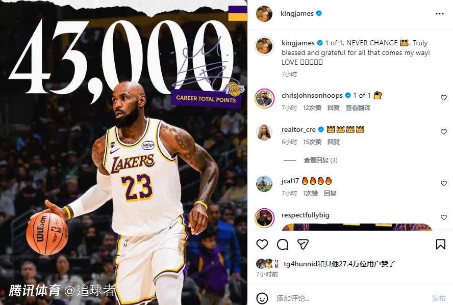 北京时间2月24日,NBA常规赛继续进行,詹姆斯在社媒上晒海报庆祝达成43000分里程碑,并且配文写道:独一无二,永远不变!对所经历的一切心怀真正的感恩与珍惜!