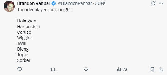 雷霆队缺席的8名球员为:霍姆格伦、哈尔滕施泰因、卡鲁索、维金斯、杰林-威廉姆斯、吉昂、托皮齐、索伯。