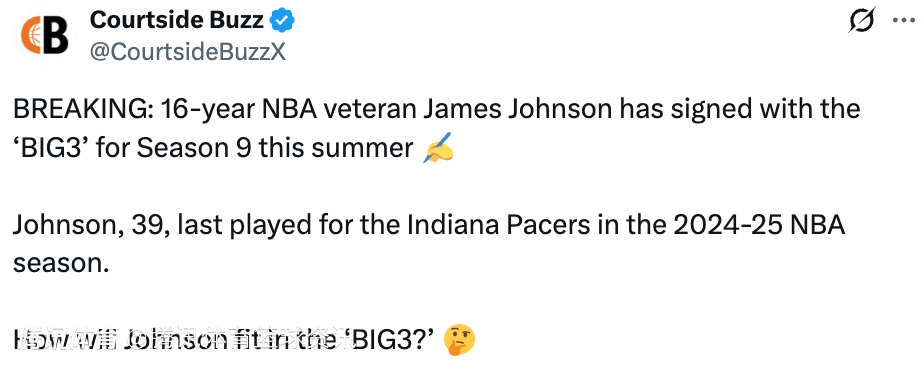 北京时间2月24日,据美媒Courtside Buzz报道,在NBA征战16年的老将詹姆斯-约翰逊,已签约BIG3联赛,将出战今年夏天的BIG3联赛。