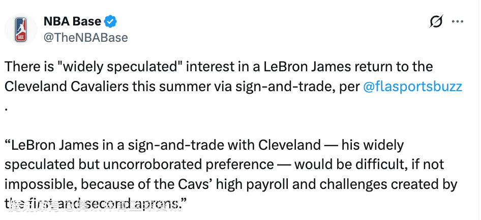 Jackson表示:“詹姆斯通过先签后换回归骑士,这是外界广泛猜测但尚未得到证实的他的首选方案,即便并非完全不可能,也会极为困难。原因在于骑士队的高额薪资,以及由工资帽上下限带来的种种挑战。”