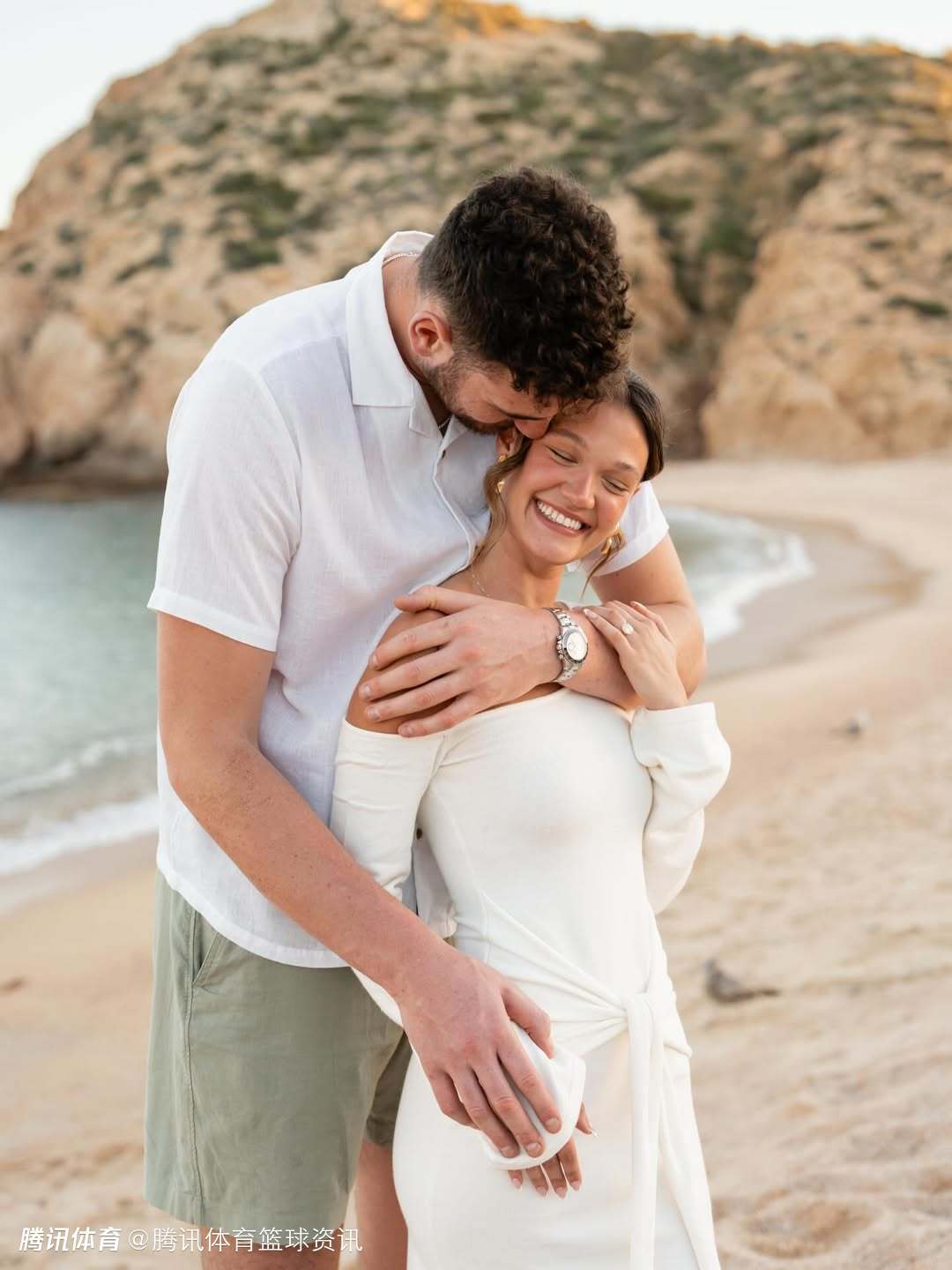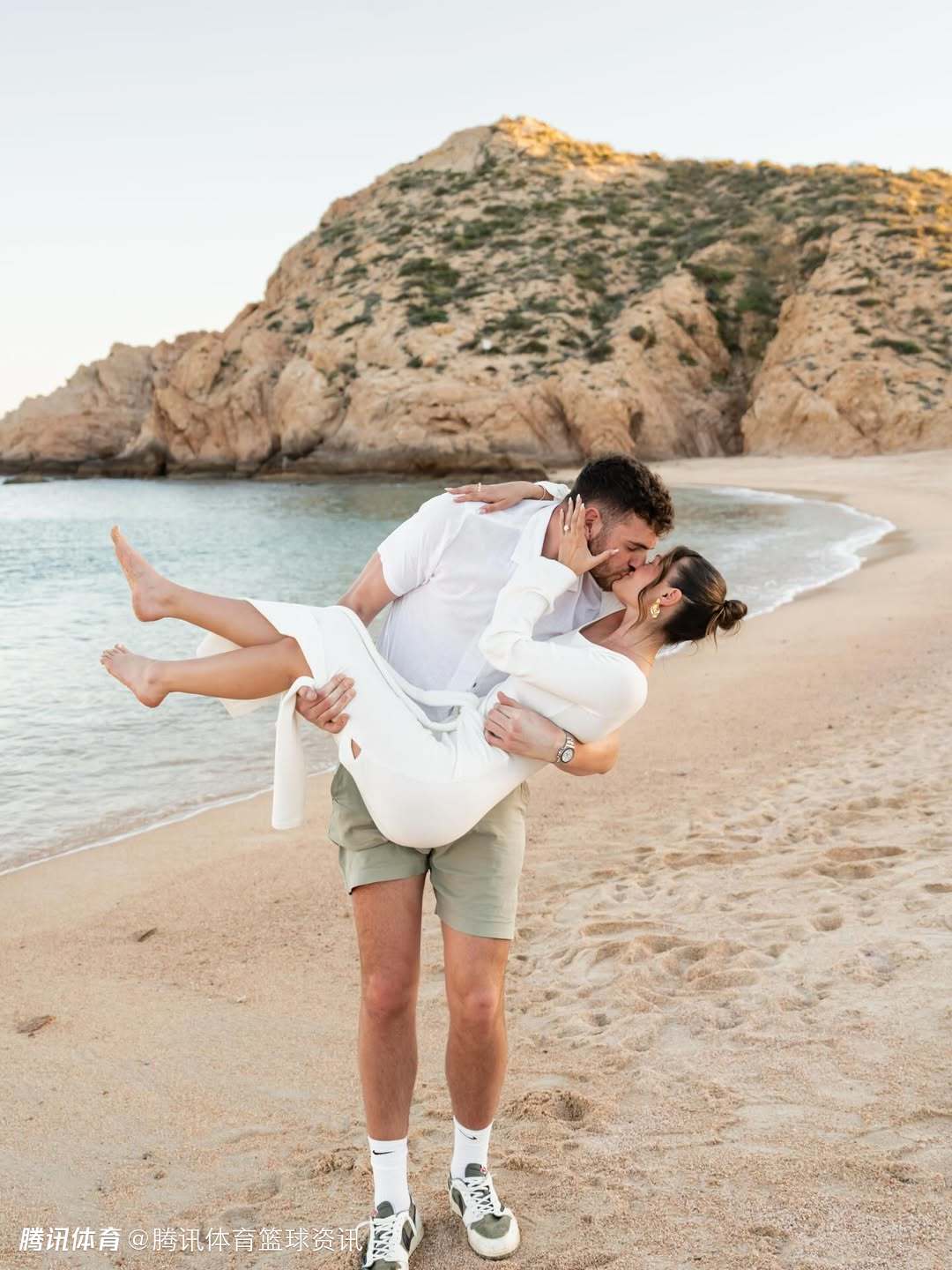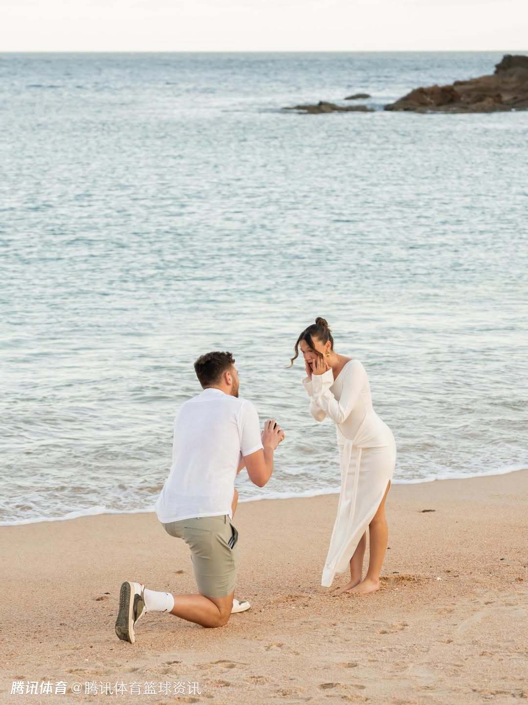 照片中,两人在风景优美的海滩上,克林根单膝跪地向女友求婚。