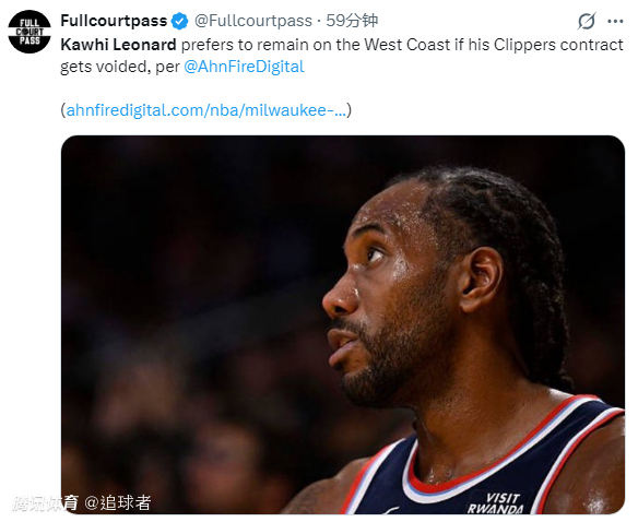 由于阴阳合同事件,小卡与快船的合同可能被联盟作废;美媒后续报道,如果科怀-莱昂纳德与快船队的合同被取消,他更倾向于留在西海岸。