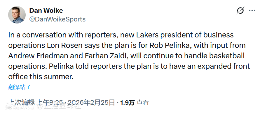 北京时间2月25日,NBA常规赛继续进行。根据湖人队记者Dan Woike的报道称,湖人队总经理佩林卡确定不会下课,他将继续负责球队的运营工作,而且今年夏天将扩大球队管理层的规模。