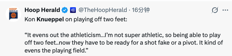 克努佩尔表示:“嗯,我觉得这确实能平衡身体的运动能力短板。要知道,我的运动能力并不是最顶尖的,如果对位的是运动能力出色的防守球员,双脚起跳的方式会更稳妥。这样一来,防守球员就必须时刻提防我出手投篮,相当于把攻守的天平拉回到一个更均衡的状态。”